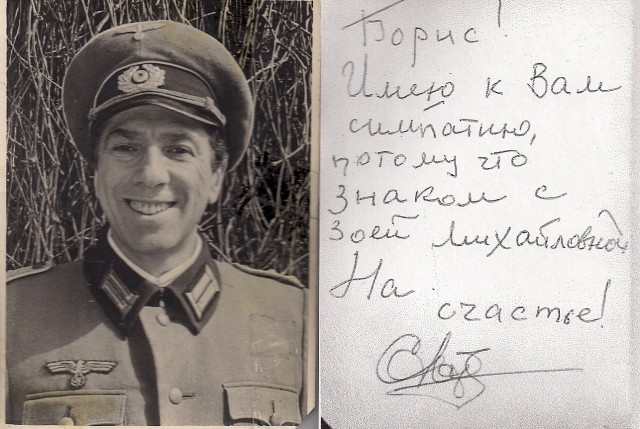 Моя близкая подруга, работая с Юрским на съёмках картины, решила послать одну из фотографий Сергея Юрьевича своему сыну в армию, который просто обожал актёра... Тут же была сделана надпись адресату. Молодой боец Борис, получив фотографию, естественно показал её всем, прибавив, что это фото его отца, пропавшего без вести во время войны. С Борей прекратили разговаривать... а некоторые, наоборот, заинтересовались... Никому и в голову не пришло, что Боря родился в 66-м, а война закончилась в 45-м... И, что вообще, это Юрский. Сам актёр смеялся очень!