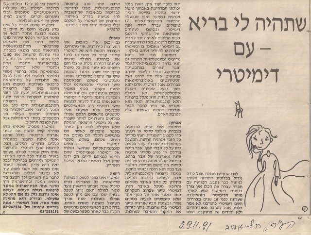 О нас стали писать в центральных газетах. Но мне было очень важно создать этому "бизнесу" прочную основу для положительного мнения людей от медицины. Я написала статью в одной из центральных газет с просьбой обратить серьёзное внимание на наше "вспомогательное лечение", как это в Израиле называется. Очень скоро это произошло, хотя друзья говорили, что вряд ли кто-то серьёзно отнесётся к статье с такой картинкой...