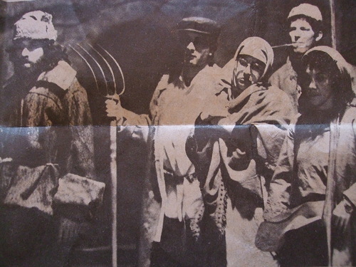 Конечно, было туго с реквизитом. Костюмы создавались "из ничего". Вилы, грабли, лопаты были в нужном количестве. А вот шапок и платков.... Находили, однако. Конечно же, выручала Сашкина гармонь настоящая (играл кое-как...). Очень лихо меха вздыхали и раздувались...