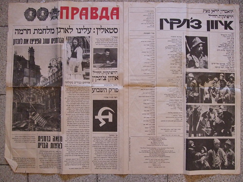 На премьере спектакля зрителям вместо обычной програмки раздавали специально изготовленную газету "ПРАВДА", где, помимо положенных данных о спектакле и фогографий к нему, была информация об авторе, о переведённой на иврит книге, различные отзывы о ней из разных стран, чуть — истории Союза... Я не знаю, как это у меня сохранилось, но сегодня эту газету я обнаружила. Как всегда, память унесла меня на тридцать лет назад...